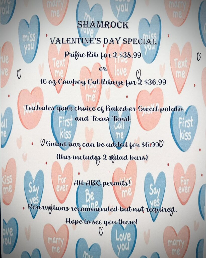 Valentine’s Day is just around the corner and Shamrock Restaurant would love to host you and your Valentine! The grill will be hot and ready for a special dinner menu starting at 5 PM. There will also be the usual seafood buffet on Friday night and you can always order from the menu. Hope to see you there! Reservation not required but recommended. Please call (252)792-5007 to book.