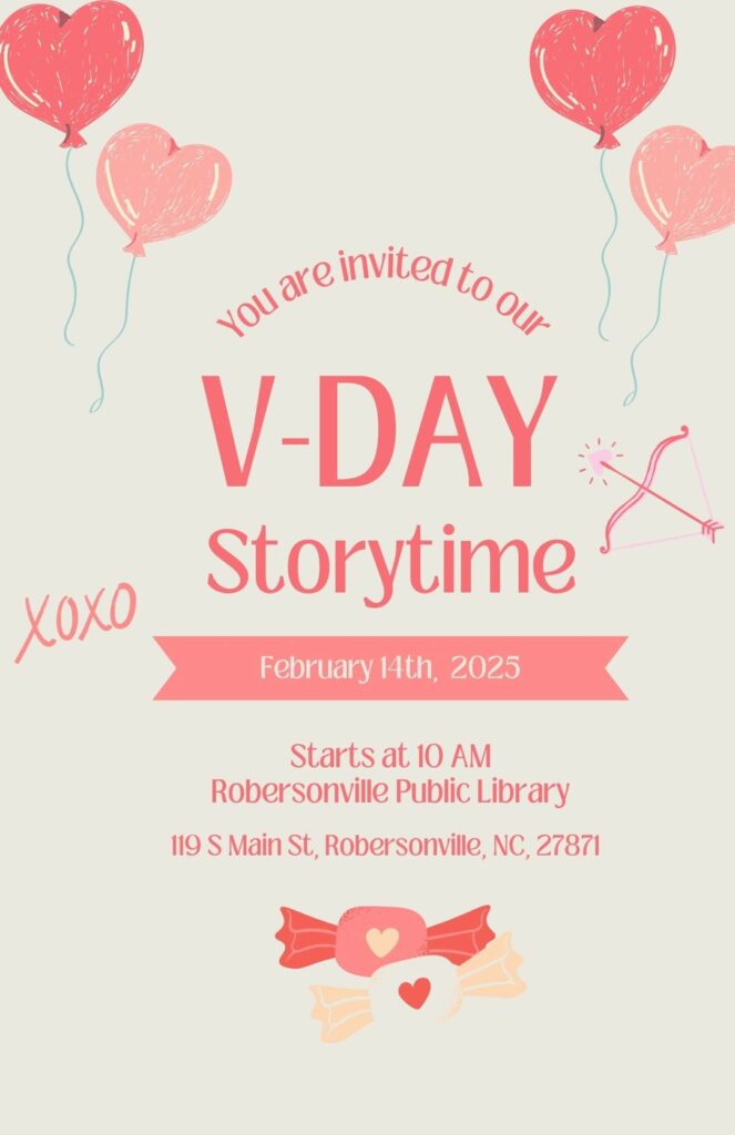 All ages are welcome to Robersonville Public Library for Valentine’s Day Storytime.