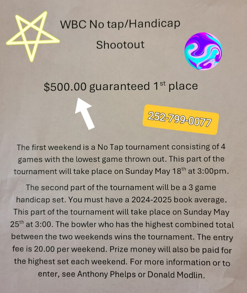 Please call Williamston Bowling Center at 252-799-0077 to join in the fun at this tournament, taking place on Sunday, May 18th!