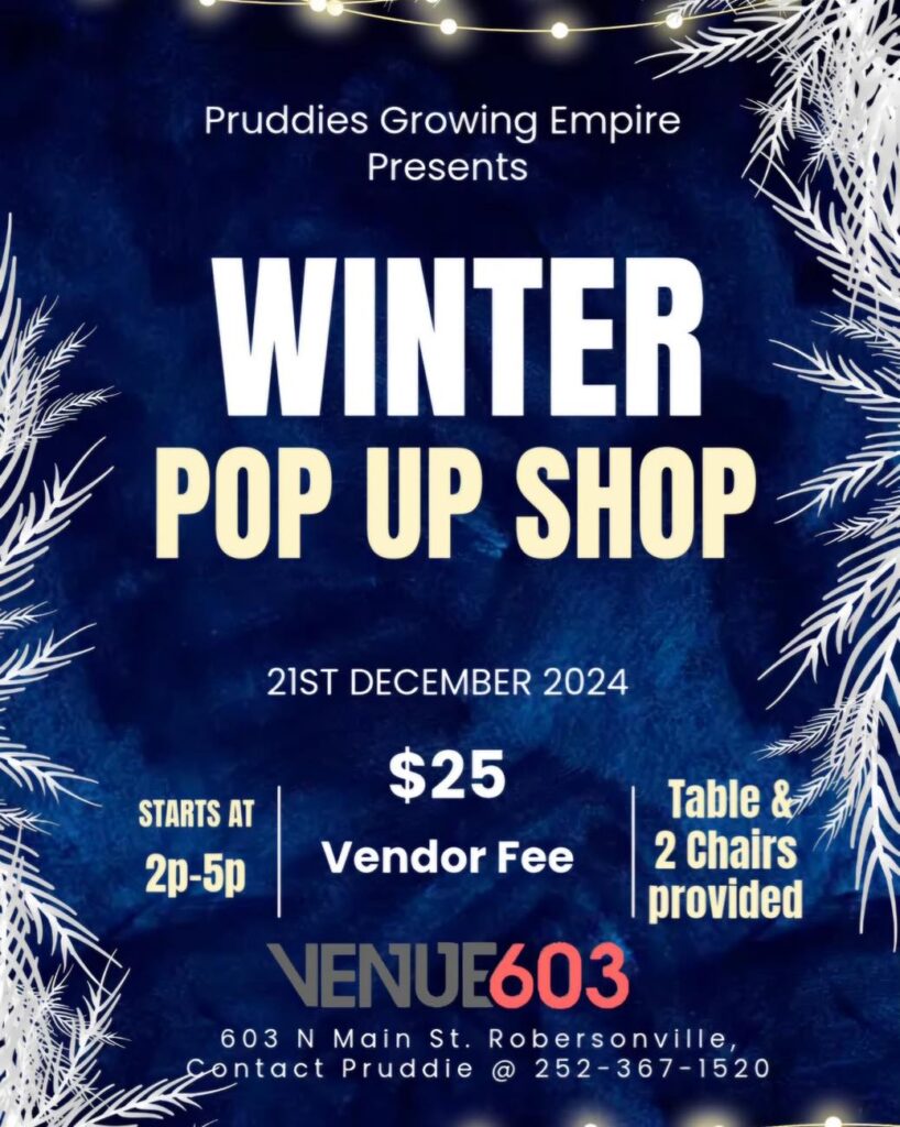Local holiday shopping event by Pruddie’s Growing Empire, a Winter Pop Up Shop at Venue 603 in Robersonville.