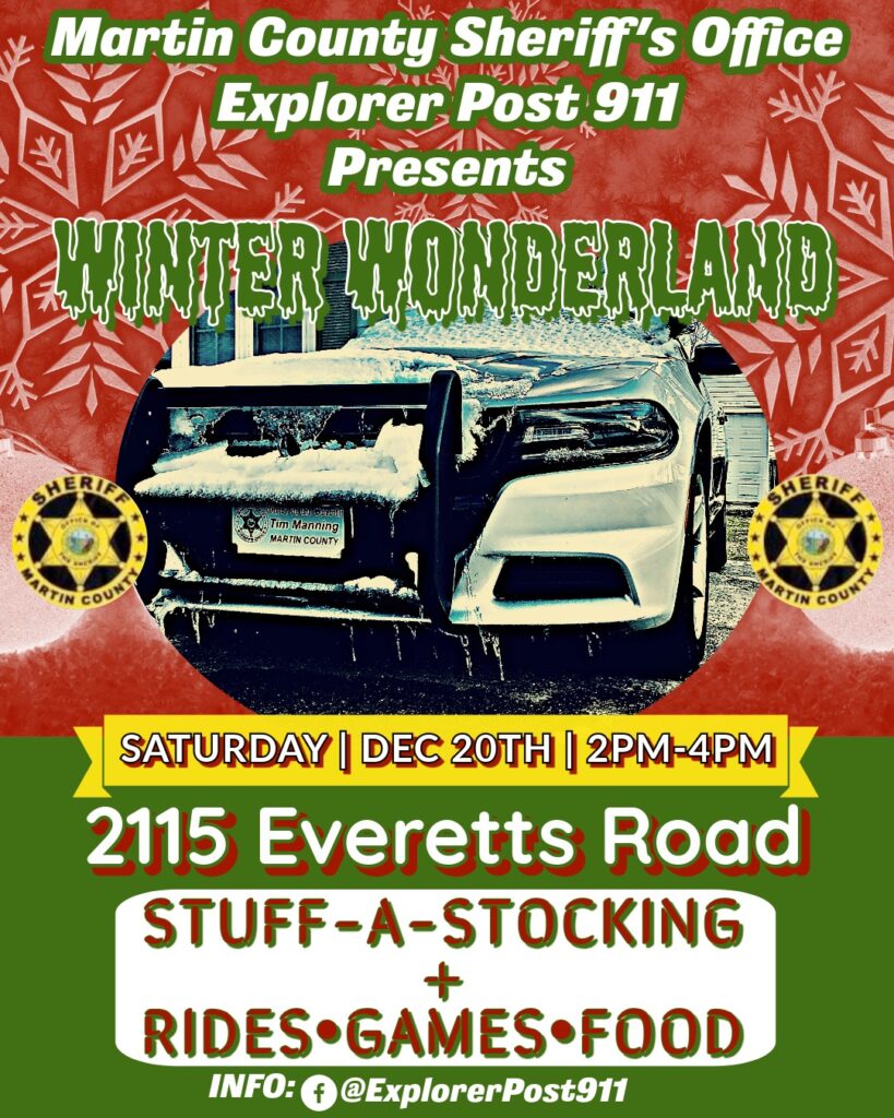 The Martin County Sheriff’s Office and Explorer Post 911 host a Winter Wonderland event with rides, games, concessions, and Santa Claus meet & greet on Saturday, December 20th, from 2 to 4 PM.