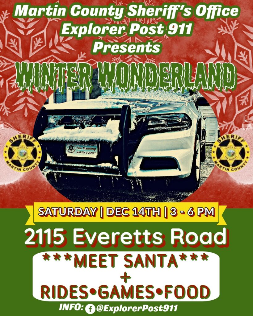 The Martin County Sheriff’s Office and Explorer Post 911 host a Winter Wonderland event with rides, games, concessions, and Santa Claus meet & greet on Saturday, December 14th from 3 to 6 PM.