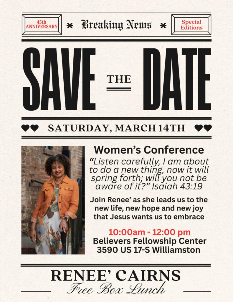 Join Renee’ Cairns as she leads a Women’s Conference on Saturday, March 14th in Williamston. All are welcome to join and enjoy a free boxed lunch during the conference!