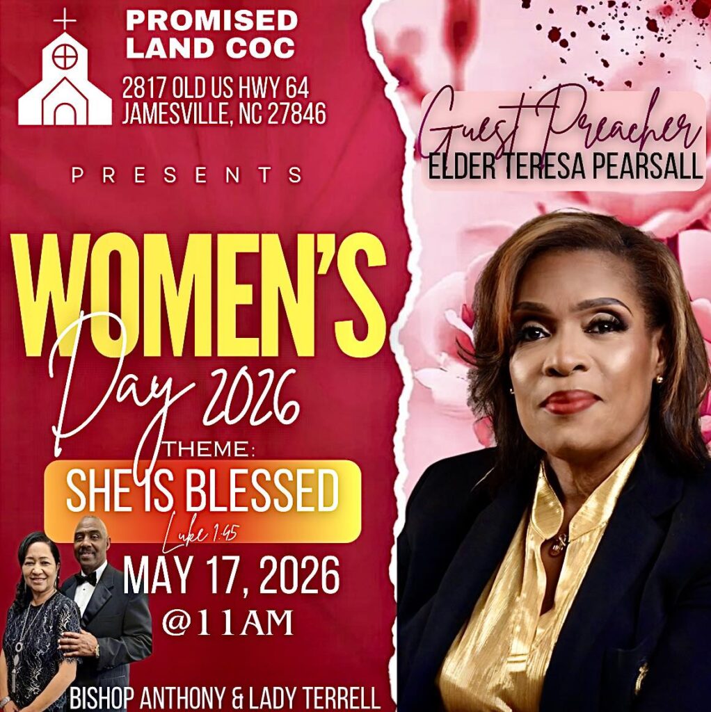 GET READY for an unforgettable, spirit-filled experience! Join Promised Land Church of Christ in Jamesville, NC & Elder Teresa Pearsall on Sunday, May 17th, 2026, at 11 AM for the annual Women’s Day 2026 service. It is a powerful time of worship, inspiration, and divine connection. You don’t want to miss this moment! Come expecting breakthroughs, joy, and a move of God like never before.